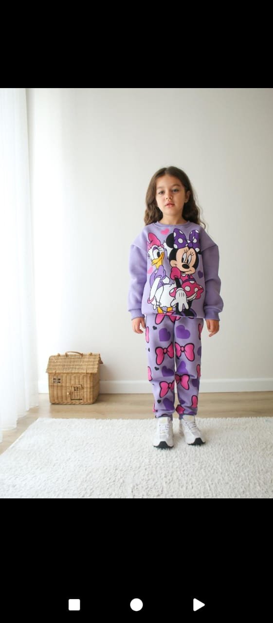 Purple kids’ outfit featuring Daisy Duck and Minnie Mouse graphics on the top, with hearts and bows on the pants. Fun and lovely design for girls.